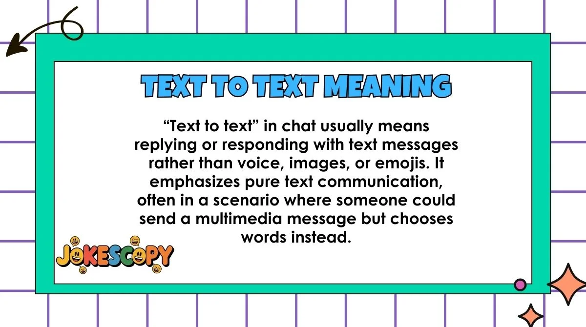 “Text to text” in chat usually means replying or responding with text messages rather than voice, images, or emojis. It emphasizes pure text communication, often in a scenario where someone could send a multimedia message but chooses words instead.